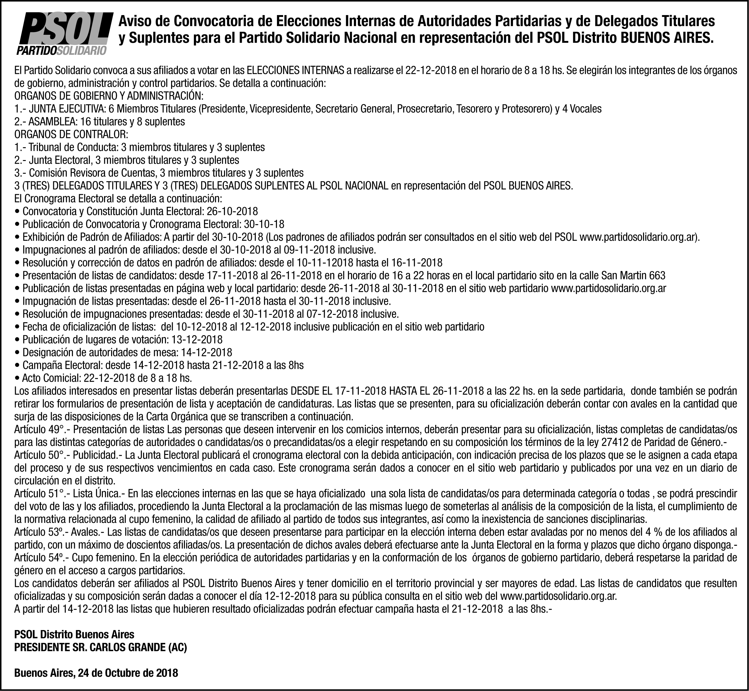 Aviso de Convocatoria de Elecciones Internas de Autoridades Partidarias y de Delegados Titulares y Suplentes para el Partido Solidario Nacional en representación del Psol Distrito Buenos Aires.