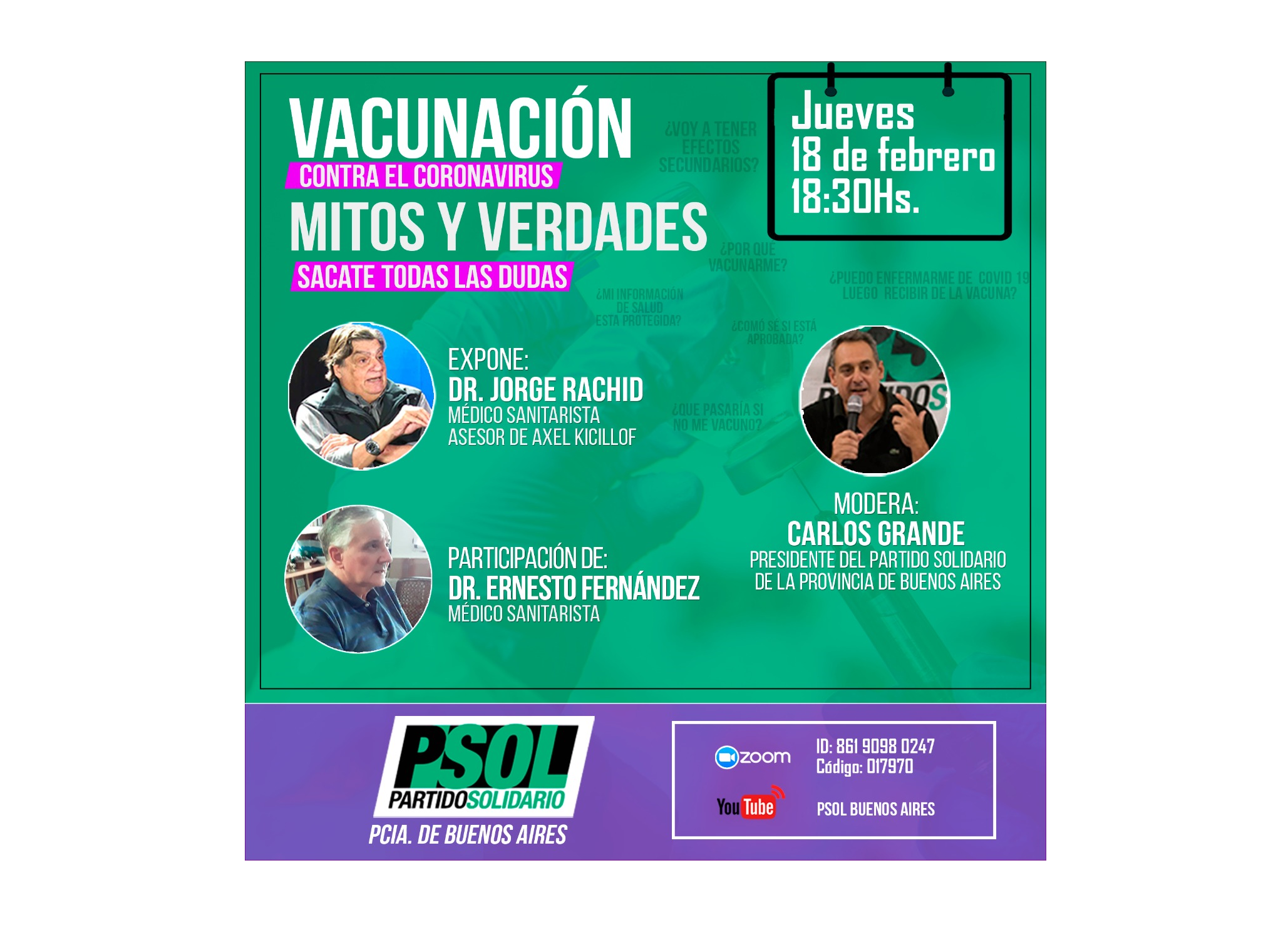 Los invitamos a participar de la actividad que realizaremos sobre “Vacunación, mitos y verdades” con el Dr. Jorge Rachid, médico sanitarista y asesor del gobernador de la provincia de Buenos Aires, y el Dr. Ernesto Fernández, también médico sanitarista; modera Carlos Grande, presidente del Partido Solidario de la provincia de Buenos Aires.